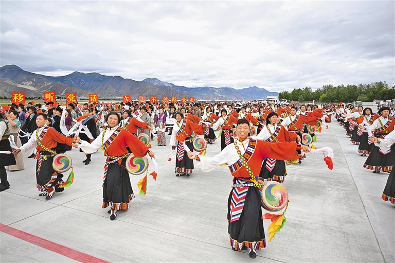 中共中央总书记、国家主席、中央军委主席习近平率中央代表团20日中午乘专机抵达拉萨,出席西藏自治区成立60周年庆祝活动。西藏各族群众代表身着节日盛装,挥动红旗和五彩花束,跳起欢快的民族舞蹈,欢迎总书记的到来,表达对总书记的衷心祝福。