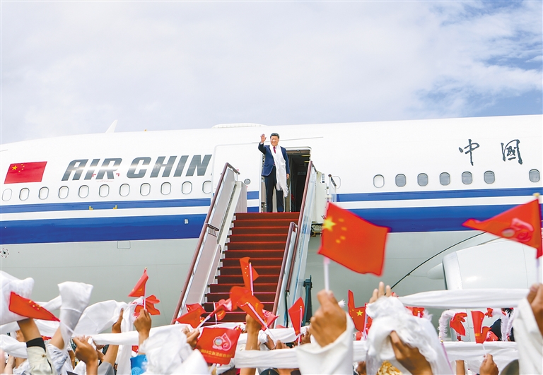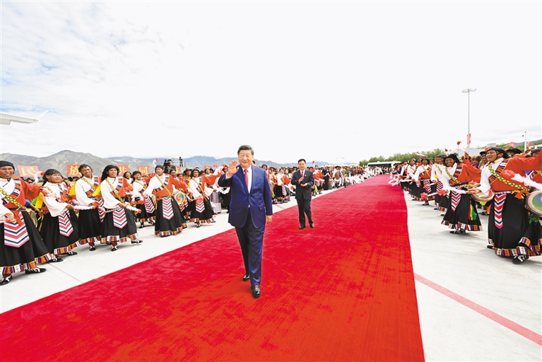 图①:8月20日中午,中共中央总书记、国家主席、中央军委主席习近平率中央代表团乘专机抵达拉萨,出席西藏自治区成立60周年庆祝活动。这是习近平向欢迎群众挥手致意。新华社记者 燕雁 摄
