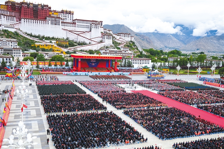 图⑥:8月21日上午,西藏各族各界干部群众约2万人欢聚拉萨市布达拉宫广场,热烈庆祝西藏自治区成立60周年。这是庆祝大会现场。