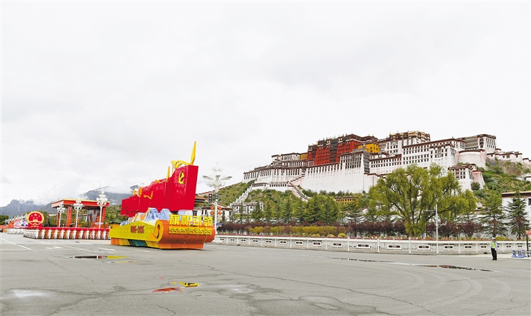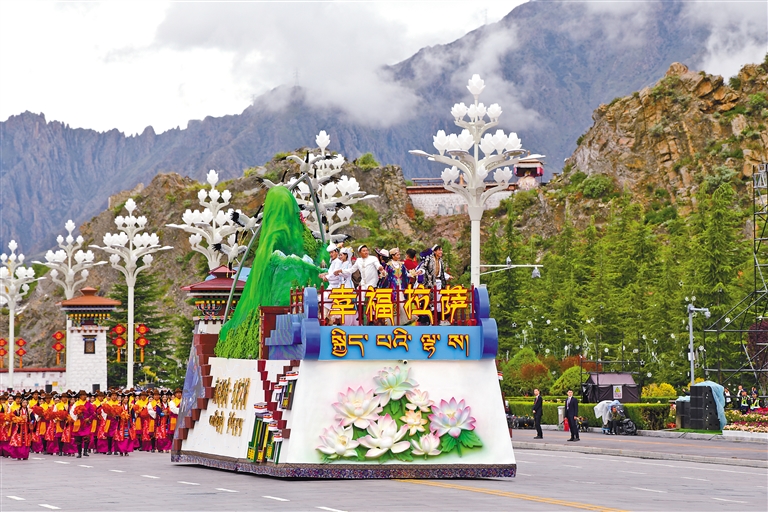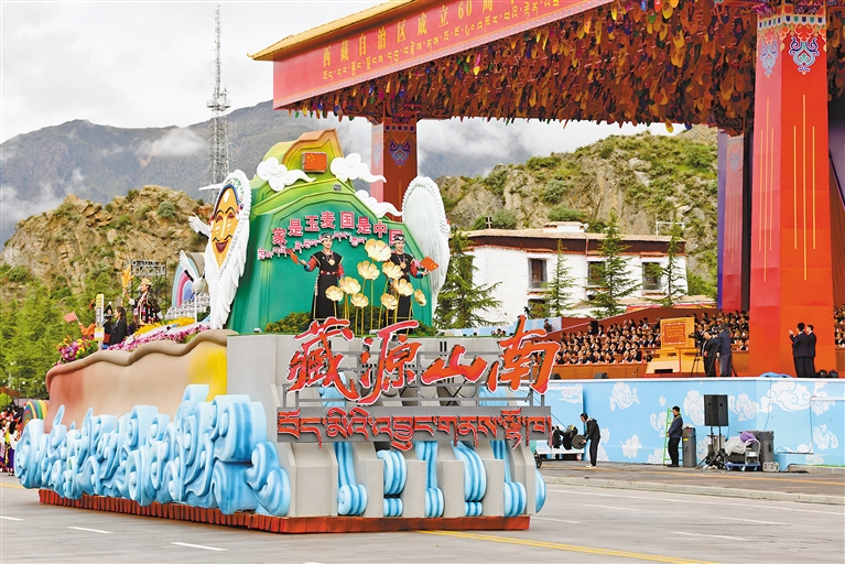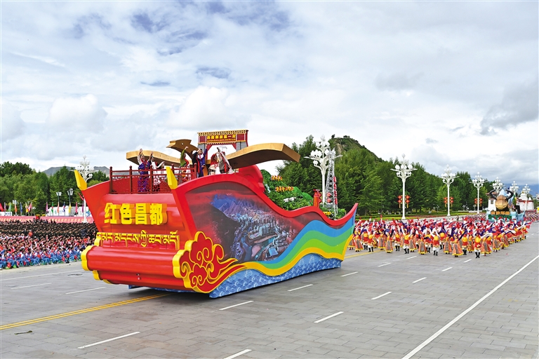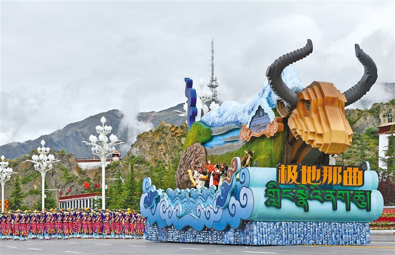 在庆祝大会群众游行环节,9辆主题彩车成为最耀眼的明星,与26个群众方队一起,组成“旗帜引领”“四件大事”“奋进新时代”“走向未来”四大篇章,在欢快鼓点中徐徐前行,铺展出一幅流动的新时代雪域长卷。打头的“旗帜引领”彩车,车头高擎巨型党旗,八面五星红旗紧随其后,昭示各族儿女永远心向党中央。收尾的“走向未来”彩车,车身以数字“60”为主体,华表、红飘带、中国结环列四周,宣示建设团结富裕文明和谐美丽的社会主义现代化新西藏的坚定决心。首尾呼应的红色,将整场游行化作一曲感恩奋进的赞歌。