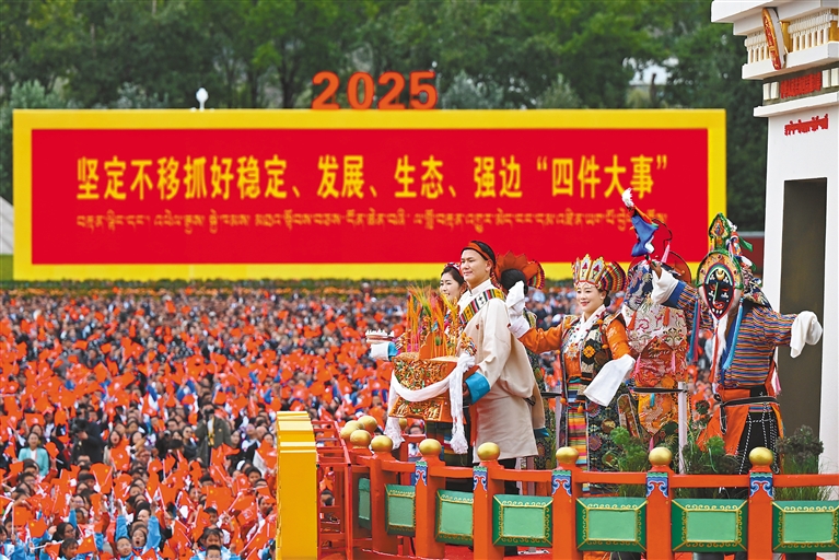 8月21日上午,西藏各族各界干部群众约2万人欢聚拉萨市布达拉宫广场,热烈庆祝西藏自治区成立60周年。这是游行的彩车通过布达拉宫广场。 新华社记者 谢环驰 摄