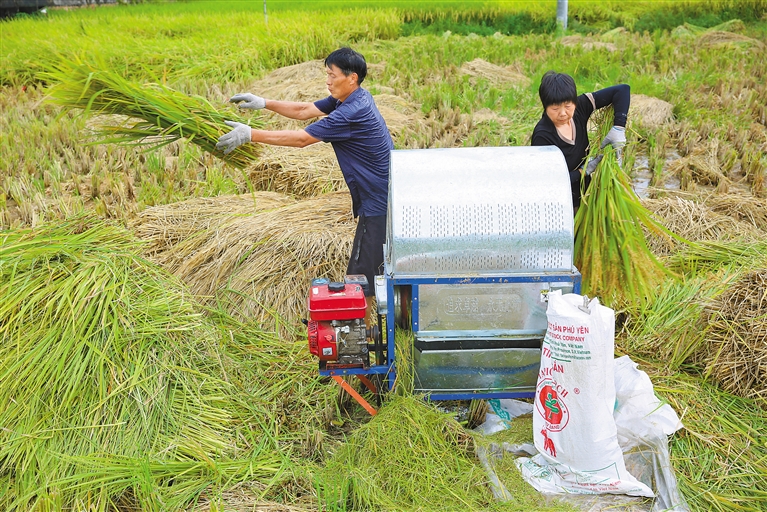 图②:在湖南省邵阳市隆回县羊古坳镇,农民使用脱粒机脱粒。