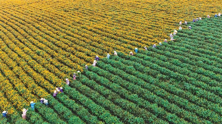 图①:农民在云南省腾冲市明光镇凤凰村凤凰山上采收万寿菊(无人机照片)。新华社发(龚祖金 摄)
