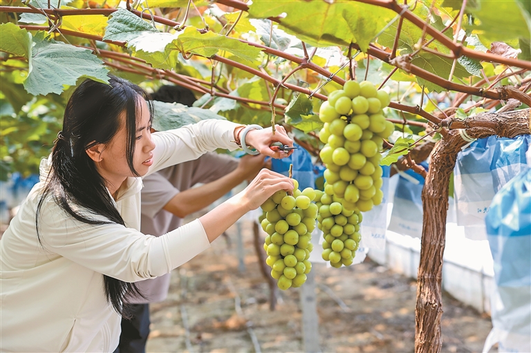 左图:8月27日,游客在虹星桥镇长兴轩乐诗农业发展有限公司的葡萄大棚内采摘葡萄。该公司是一家集高科技农业种植、休闲观光、电商销售于一体的现代化农业企业, 7-8月主要产出阳光玫瑰葡萄,占地120亩,亩产3000斤。新华社记者 徐昱 摄