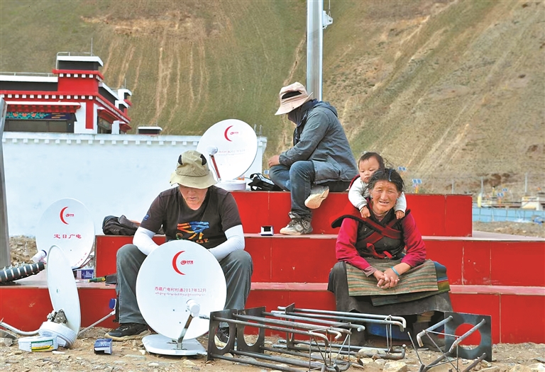 图为在定日县措果乡野江村,工作人员为群众安装广播电视直播卫星“户户通”设备。