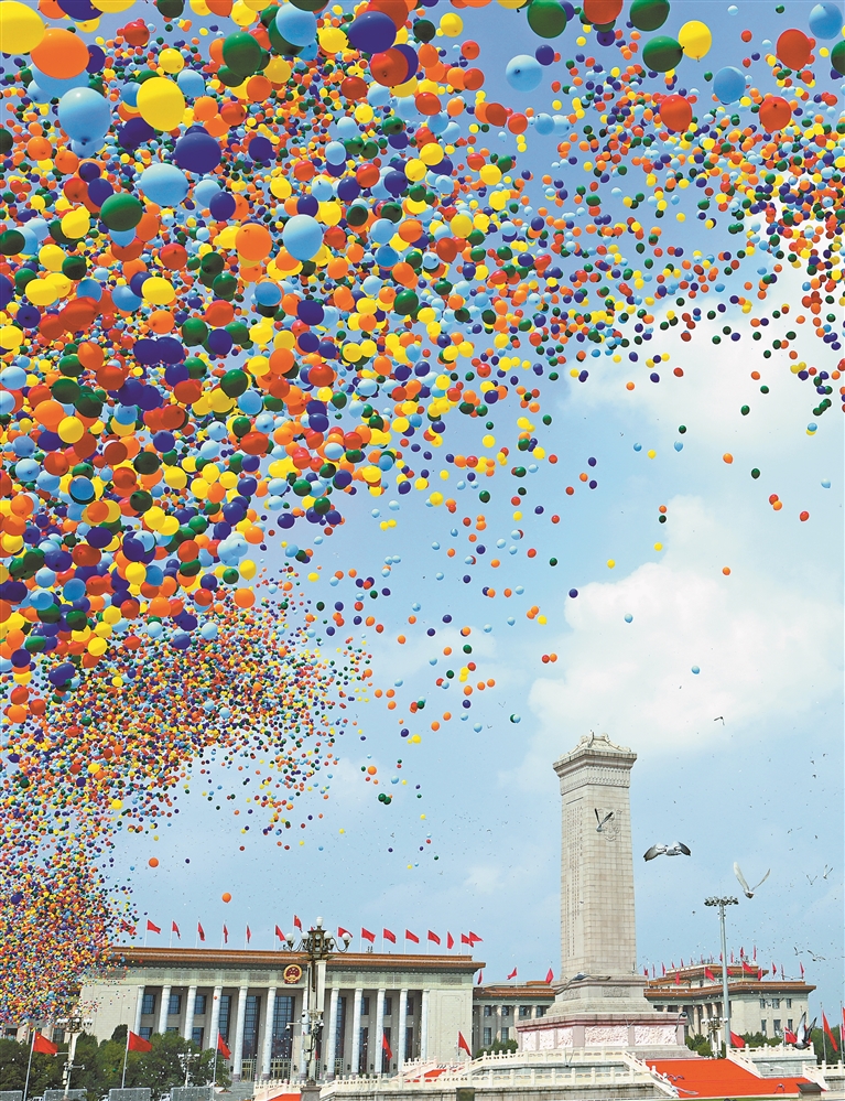 纪念大会现场放飞气球和鸽子。新华社记者 牟宇 摄