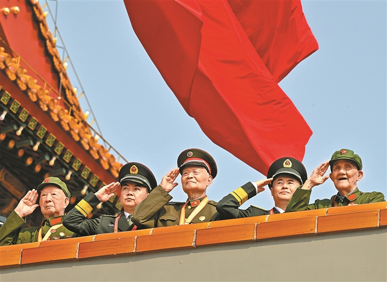 观礼嘉宾在天安门城楼上敬礼。新华社记者 岳月伟 摄