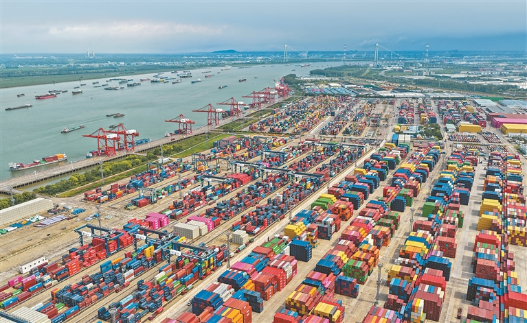 9月8日,海关总署发布8月份外贸数据,我国货物贸易进出口总值3.87万亿元,同比增长3.5%,其中出口2.3万亿元、进口1.57万亿元,同比分别增长4.8%和1.7%,连续3个月实现双增长。图为9月8日拍摄的江苏省港口集团南京港龙潭港区(无人机照片)。新华社发(方东旭 摄)