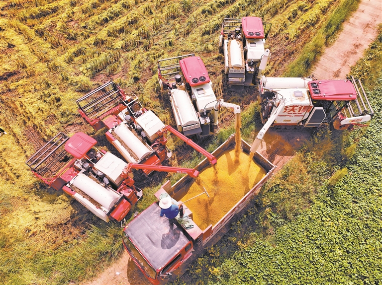 9月11日,四川省达州市渠县宝城镇马鞍村农民在装卸刚收割的稻谷。新华社发(邓良奎 摄)