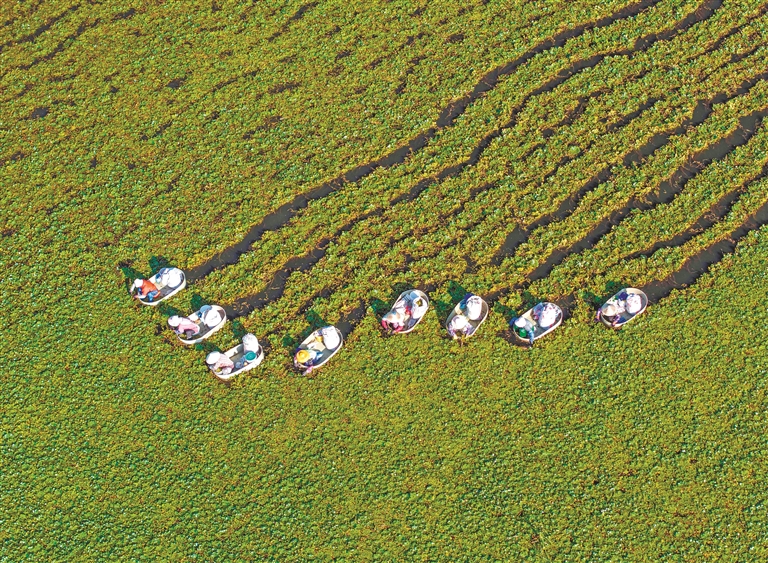 9月10日,村民在江苏省泰州市海陵区苏陈镇张家院社区采摘菱角(无人机照片)。新华社发(周社根 摄)
