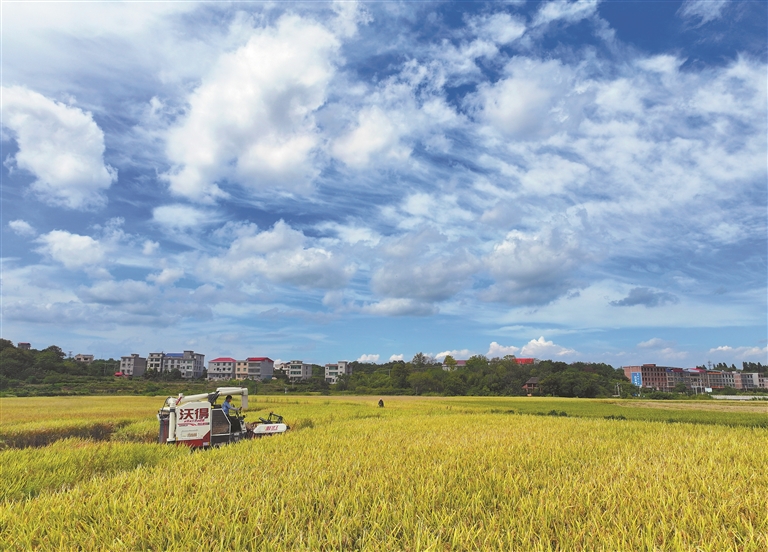 9月11日,湖南省衡阳市衡东县石滩乡村民驾驶农机收割稻谷(无人机照片)。新华社发(曹正平 摄)