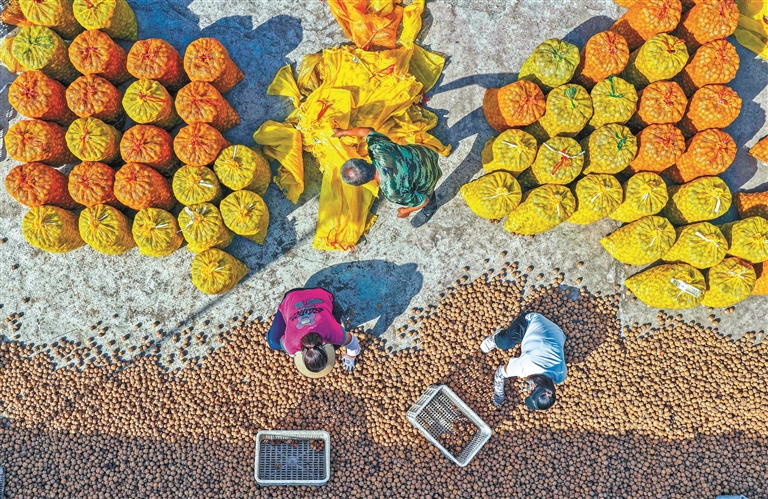 9月8日,河北省遵化市合丰农产品专业合作社的社员,在场院包装晒干的核桃(无人机照片)。新华社发(刘满仓 摄)