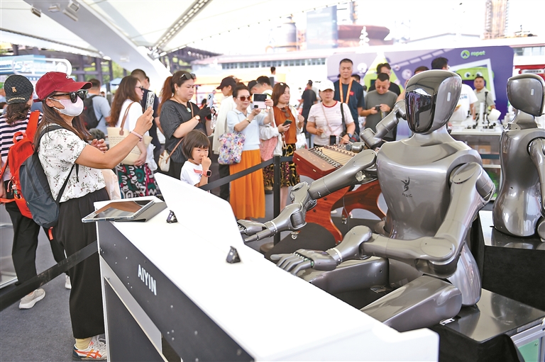上图:9月11日,参展者在服贸会拍摄弹钢琴的人形机器人。新华社记者 刘岭逸 摄