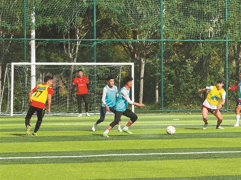 图为拉萨滨河体育公园内,足球爱好者们正在比赛。