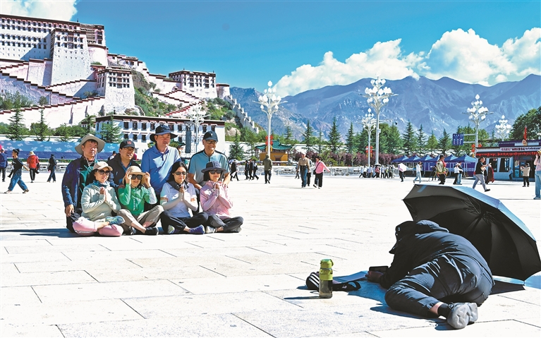 图为游客在布达拉宫广场拍照留念。本报记者 唐斌 摄