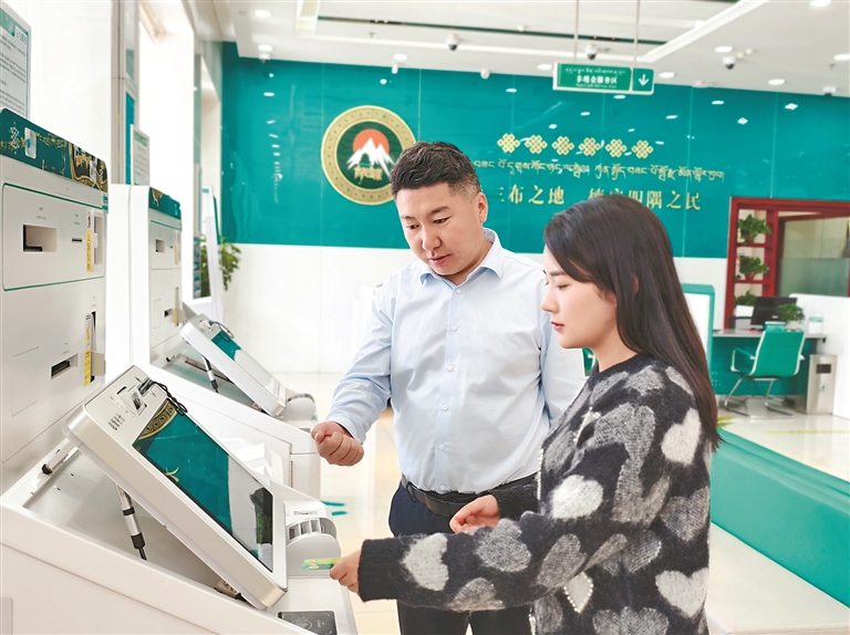 今年以来,人民银行林芝市分行围绕“数字林芝”建设目标,积极推动金融科技与实体经济深度融合。 图为农行林芝厦门广场支行工作人员为客户在智慧柜员机上办理业务。本报记者 王珊 摄