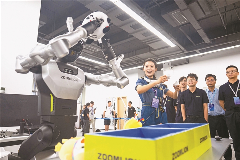 图为9月15日,在湖南湘江新区长沙智谷,观众操作人形机器人进行娃娃抓取。新华社记者 陈思汗 摄