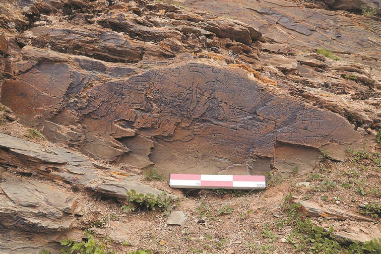 文物考古工作者于2023年7月在青海省玛多县扎陵湖畔对尕日塘秦刻石进行现场考察时拍摄的该刻石遗迹照片。新华社发