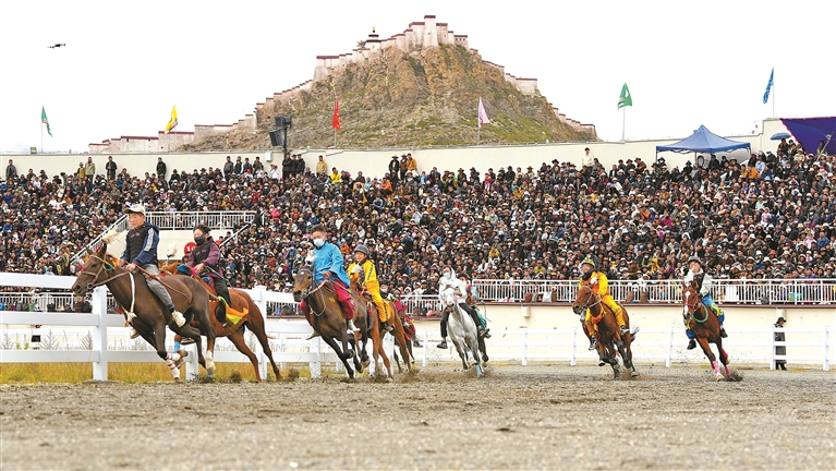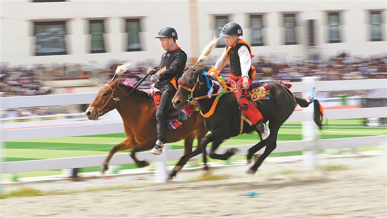 “达玛”藏语意为“跑马射箭”。每年的达玛节,赛马都会吸引十里八乡的人们前来观赛。赛马场上人头攒动,随着发令声响,一匹匹骏马如离弦之箭冲出起跑线,骑手俯身贴在马背上,扬鞭驰骋,你追我赶,奋勇争先。观众席上,人们随着比赛节奏,时而激动,时而安静,时而欢呼,时而叹息。藏族阿妈次仁卓嘎难掩激动,她告诉记者,几乎每年都会和家人来看赛马。赛场上,选手们坚韧不拔、昂扬向上的精神风貌让人动容,也激励着一代又一代英雄城儿女为祖国发展繁荣而不懈奋斗。