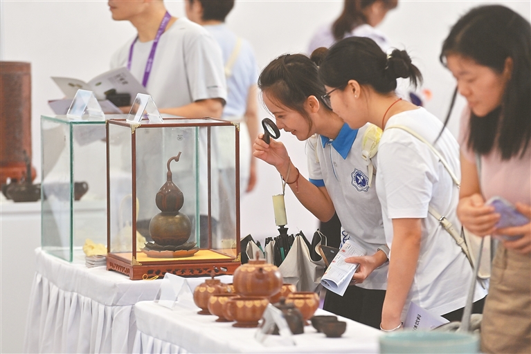 图②:在广西南宁国际会展中心,人们参观坭兴陶作品。