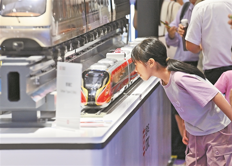图③:在广西南宁国际会展中心,小朋友在参观动车组模型。