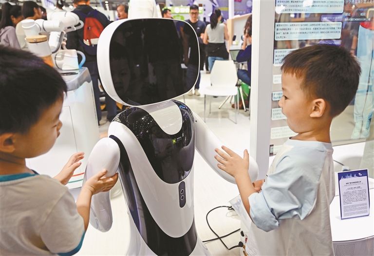 图②:9月21日,小朋友在2025世界制造业大会智能机器人展区和一款机器人互动。