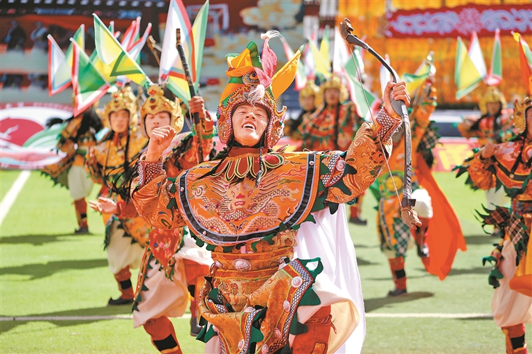 9月15日举行的第十一届三江茶马文化艺术节开幕式上,来自昌都11个县(区)的群众代表组成游行方队,载歌载舞,绕场一周,热烈激昂的丁青热巴、豪迈威武的类乌齐岭卓舞、优美欢快的芒康弦子等非遗舞蹈,向现场的干部群众和各界来宾展示了昌都独特的传统文化和热情好客的真挚情谊。随后的文艺表演以歌舞和情景剧的形式,从金沙江的红色记忆,到怒江的文化传承,再到澜沧江的高质量发展之光,描摹出了昌都历史文化的主要脉络和经济社会发展取得的巨大成就,为现场观众奉献了一场难忘的文艺盛宴。