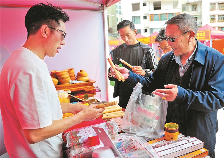 图④:特色产品展销柜台,市民正在选购洛隆藏香。