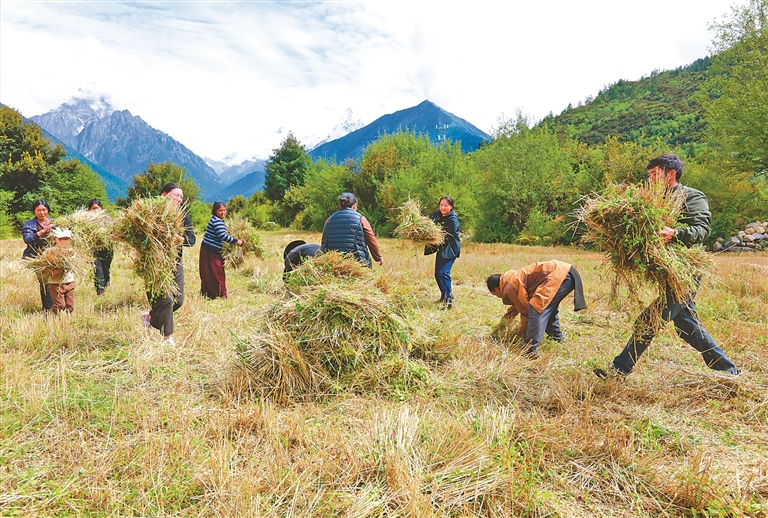 图④:拉萨市墨竹工卡县唐加乡莫冲村村民正在晾晒收割好的青稞。