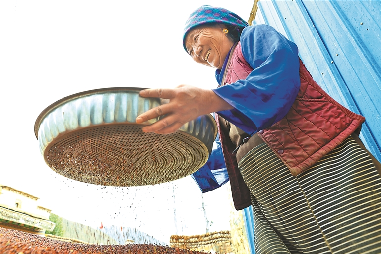 图③:拉萨市墨竹工卡县唐加乡莫冲村村民正在筛菜籽。