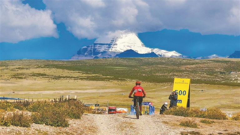 图为冈仁波齐峰前,选手在奋力骑行。本报记者 明吉 摄