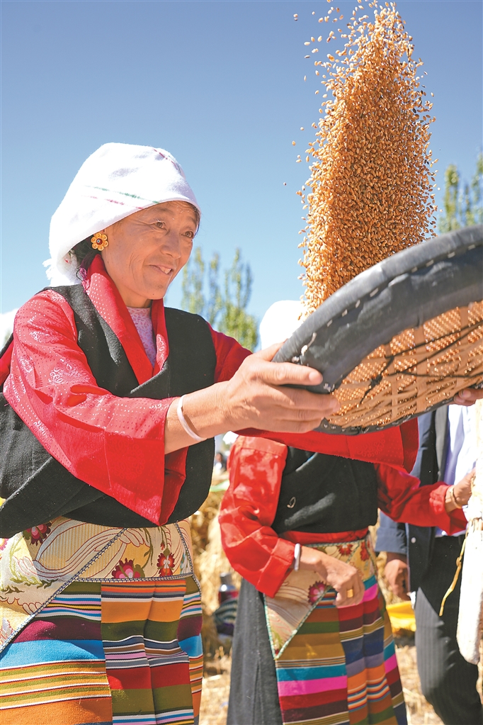 图为拉萨市林周县典冲村村民用传统方式让青稞脱粒。本报记者 索朗旺久 摄