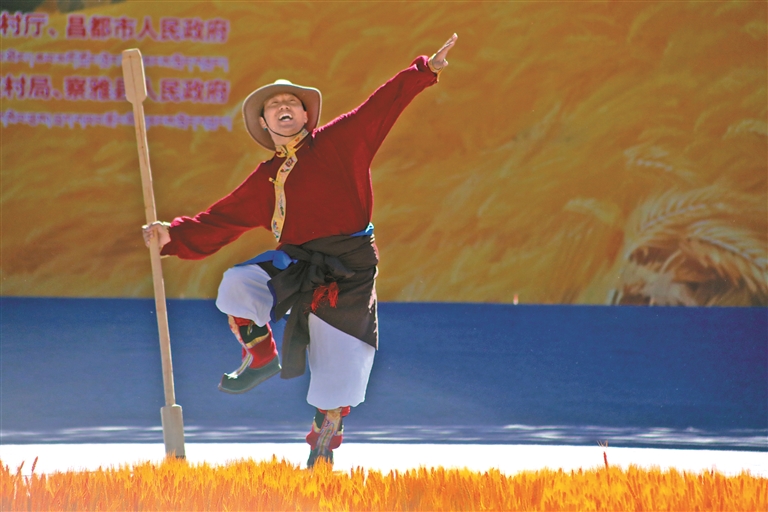 图为昌都市中国农民丰收节庆祝活动中,边坝县艺术团演员进行歌舞表演。本报记者 平措朗加 温凯 摄
