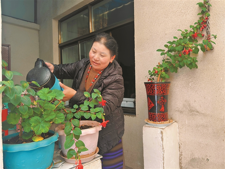 一走进格培家,映入眼帘的是阳光房里的绿植。格培的妻子斯曲正弯着腰精心打理盛开的花。看到客人,她直起身,脸上瞬间绽放出比盆中鲜花更灿烂的笑容。步入宽敞的客厅,引人注目的是靠墙立着的一排崭新锃亮的藏式柜子。柜子上,精心装裱在相框里的奖状,整齐排列,无声地诉说着主人的荣光。记者驻足柜前,细细辨认着上面的文字。