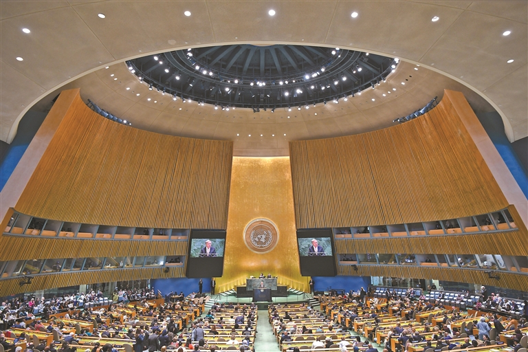 图为9月22日在位于纽约的联合国总部拍摄的联合国大会纪念北京世妇会30周年高级别会议现场。新华社记者 李睿 摄