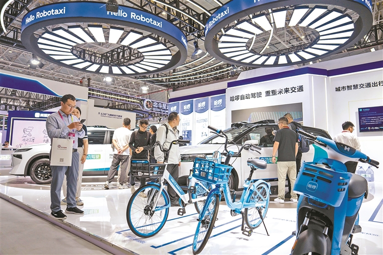 图为9月24日,在株洲国际会展中心,观众(左一)在拍摄配有北斗技术的共享单车。