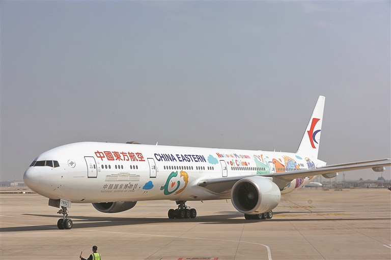 中国国家博物馆与中国东方航空联合推出的“国博号”主题彩绘飞机将于9月29日在北京大兴机场首航,飞往上海浦东,并以此为起点,逐步投入国内、欧美澳等重点航线及“一带一路”国际航线,架起文化传播的“空中桥梁”。图为9月28日在北京大兴国际机场拍摄的“国博号”彩绘主题飞机。新华社发(卢旭 摄)