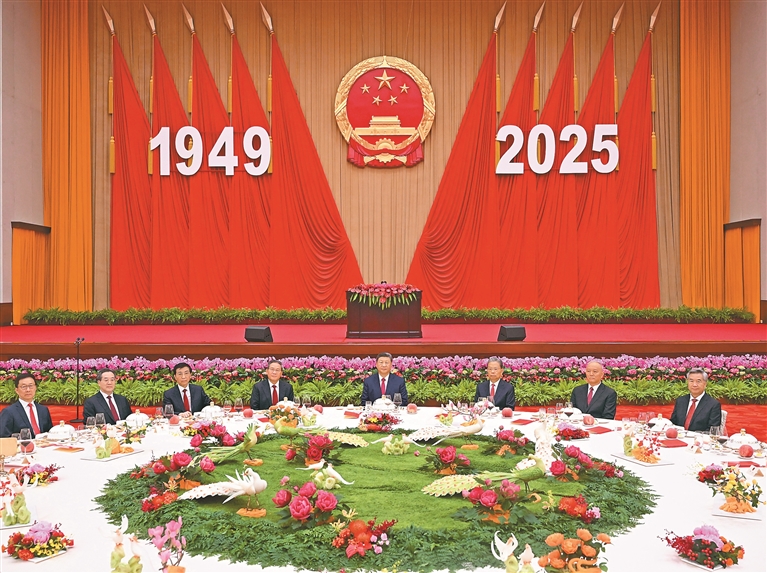 习近平指出,新中国76年来,党领导人民自力更生、接续奋斗,取得彪炳史册的辉煌成就。回望历史,中华民族从濒临危亡走向伟大复兴,一路筚路蓝缕、充满艰辛,也一路豪情满怀、凯歌高奏。前不久,我们隆重纪念中国人民抗日战争暨世界反法西斯战争胜利80周年,极大振奋了民族精神、激发了爱国热情、凝聚了奋斗力量。