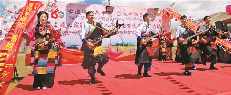 在这片希望的田野上,日喀则市各族干部群众满怀喜悦,以多种形式展示60年来农业发展取得的丰硕成果,庆祝2025年中国农民丰收节。