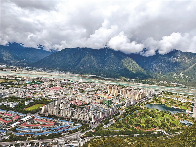 林芝市区,城市建筑错落有致,与葱郁山林、蜿蜒河流相映成趣,展现出高原城市独特的生态之美与蓬勃生机,尽显林芝作为“雪域江南”的独特魅力。本报记者 王珊 谢筱纯 摄
