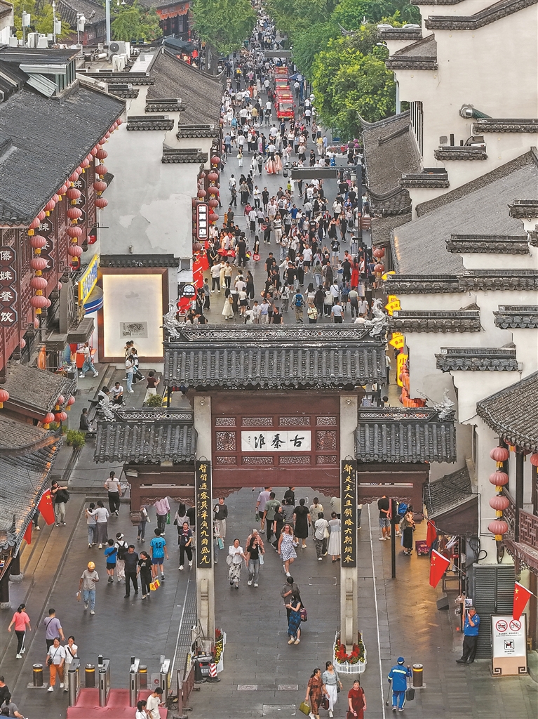 ▼10月7日,游客在江苏省南京市秦淮区的夫子庙景区休闲游玩(无人机照片)。新华社记者 李博 摄