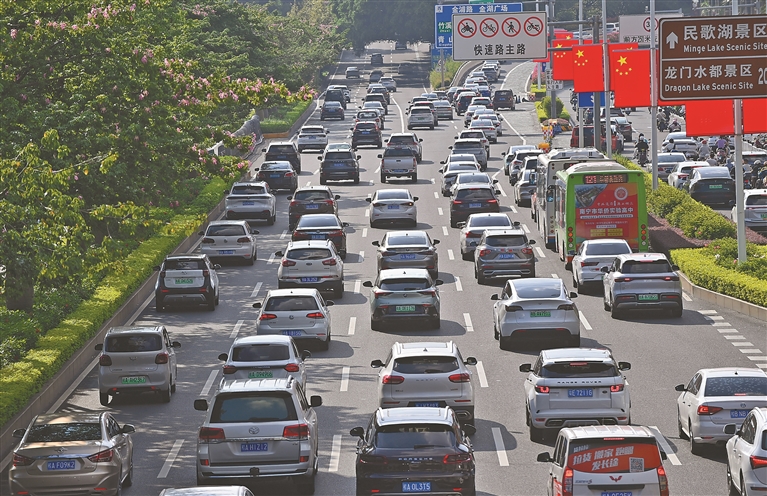 左图:10月8日,进城车辆行驶在广西南宁市民族大道上。