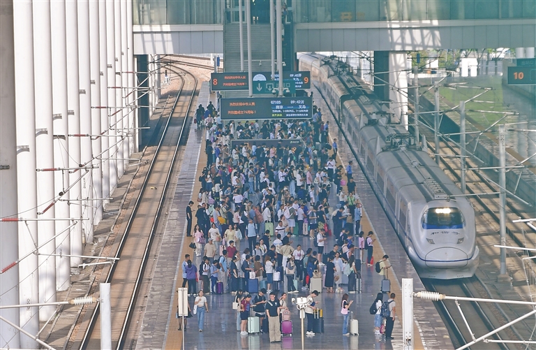 上图:10月8日,旅客在江苏无锡火车站站台乘车。