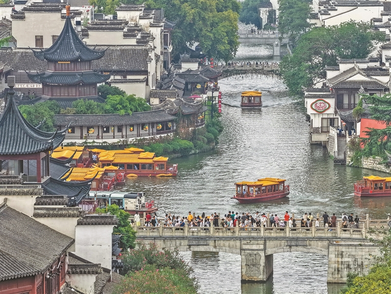 10月7日,游客在江苏省南京市秦淮区的夫子庙景区休闲游玩(无人机照片)。新华社记者 李博 摄