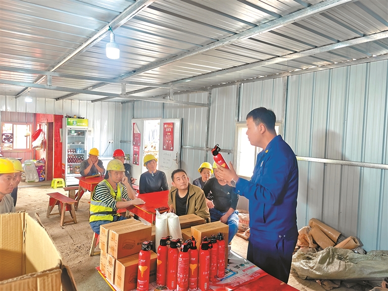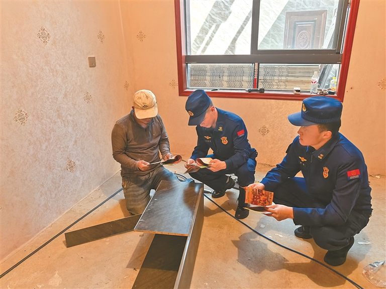 消防宣传员在一装修现场,为动火作业操作员科普动火作业安全常识。