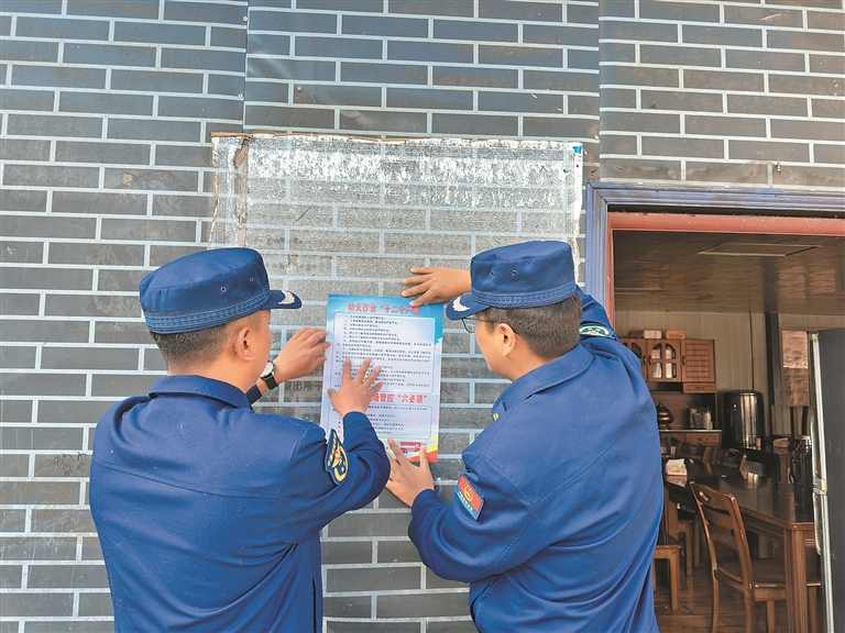 消防宣传员在商场附近张贴动火作业安全相关宣传海报。