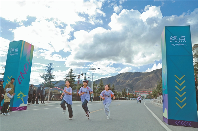 近日,拉萨市墨竹工卡县组织开展“墨守初心·竹梦前行”主题荧光夜跑活动,全县机关党员干部、各行业职工代表、农牧民群众及中小学生等400余人参与活动。图为参加夜跑活动的学生冲过终点。本报记者 格桑伦珠 摄