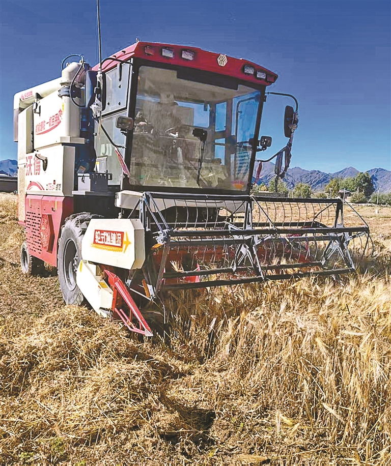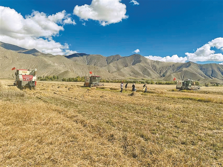 金秋的日喀则市桑珠孜区东嘎乡,金黄的青稞翻着波浪,4台联合收割机轰鸣着穿梭其间,巨大的拨禾轮把青稞卷进机身,秸秆碎屑在空中划出金色弧线,青稞麦粒如瀑布般泻进拖拉机斗……