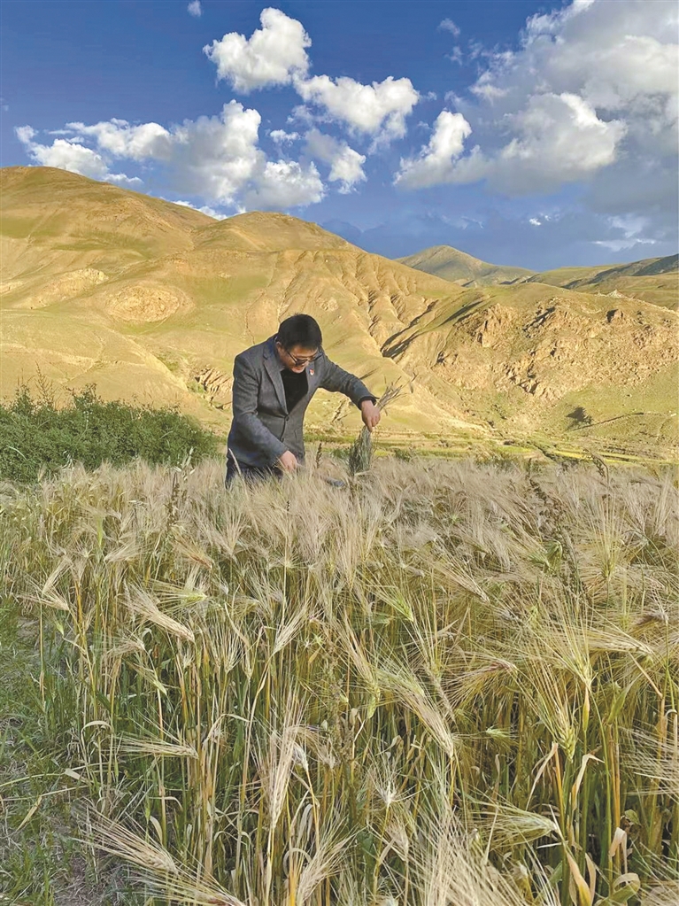 近日,援藏教师张健波在山南市措美县农田帮助村民收割青稞。本报通讯员 白玛旦增 摄