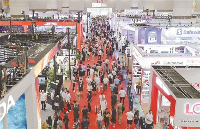 图为10月15日,客商在广交会上参观。新华社记者 卢汉欣 摄